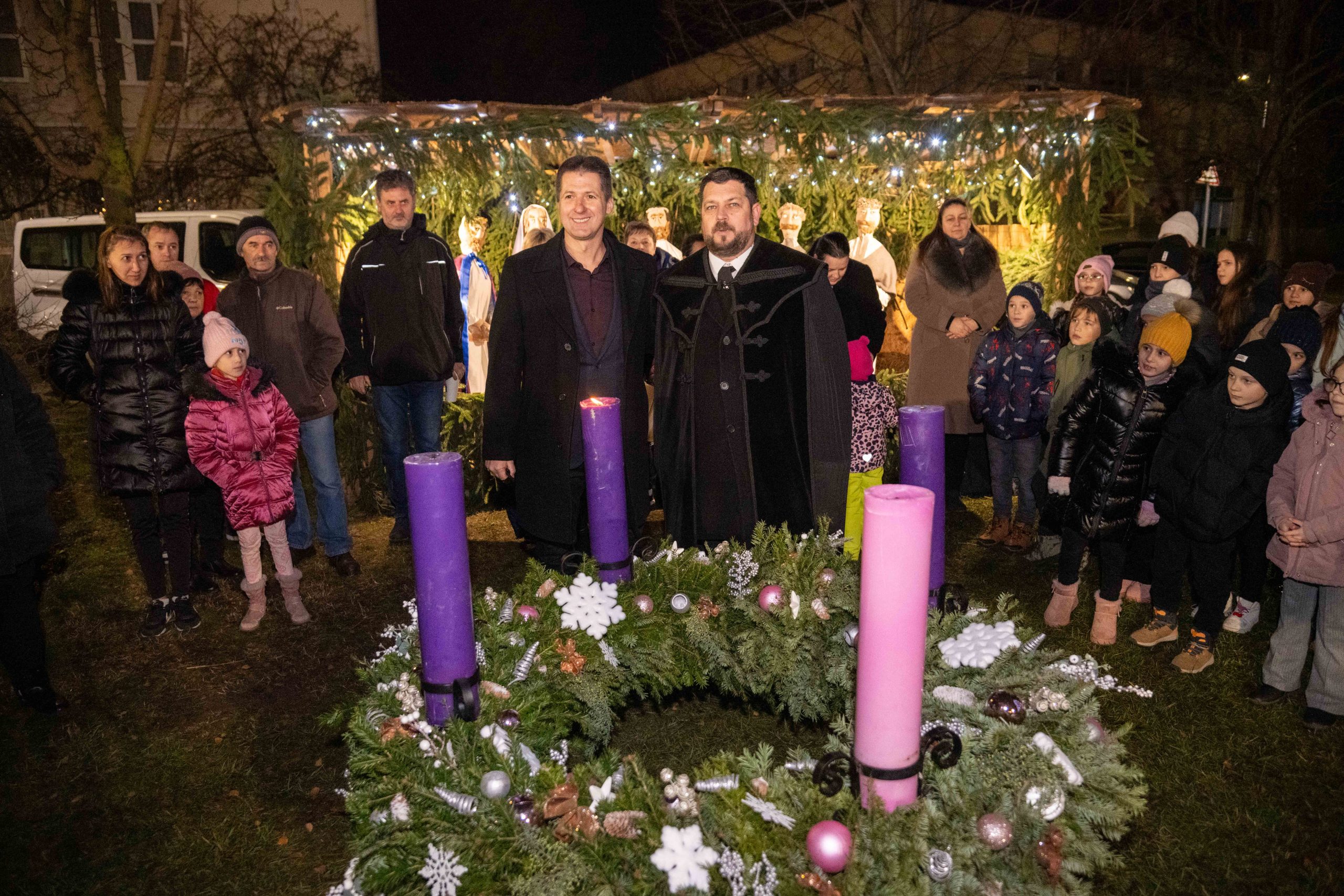 A folytatásban Kovács Zoltán református lelkipásztor mondott áldást, majd meggyújtották az első, a hitet jelképező lila gyertyát a hatalmas adventi koszorún.